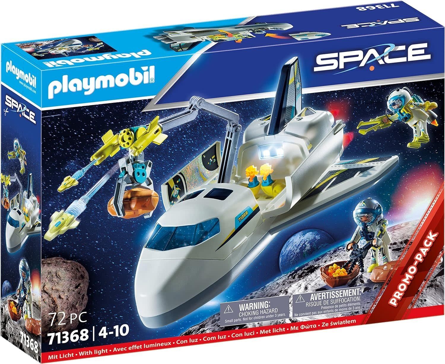 The PLAYMOBIL Space Shuttle Mission with two astronauts in research gear, light effects for rocket engine and interior lighting. Firing cannons fend off threats. The light module requires three 1.5 V AAA micro batteries (not included). ages 4+